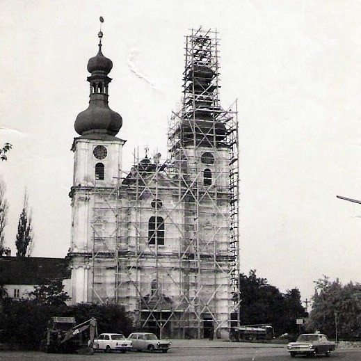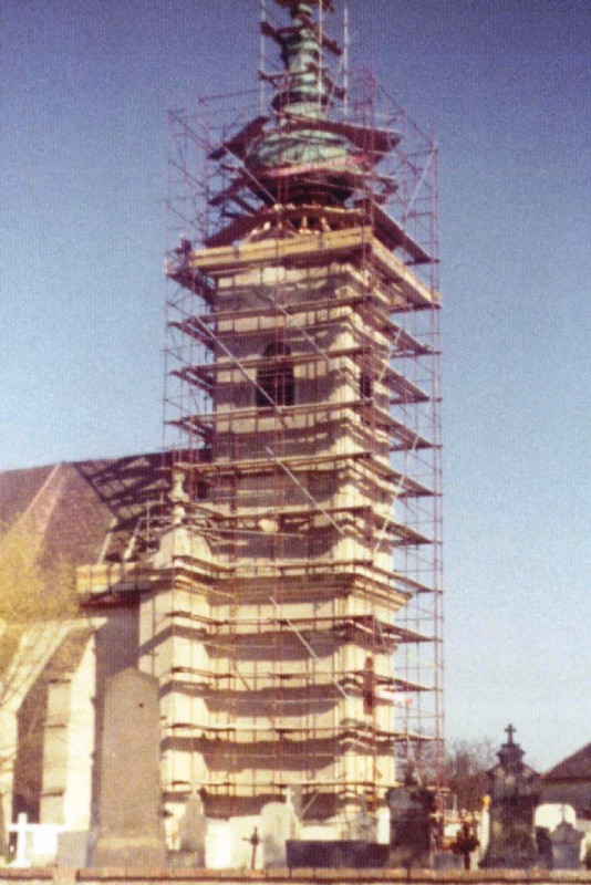 Auch Kirchen und Kapellen - hier der Karner in Mödling - wurden mit Leitern und Pfosten aus Holz gerüstet.