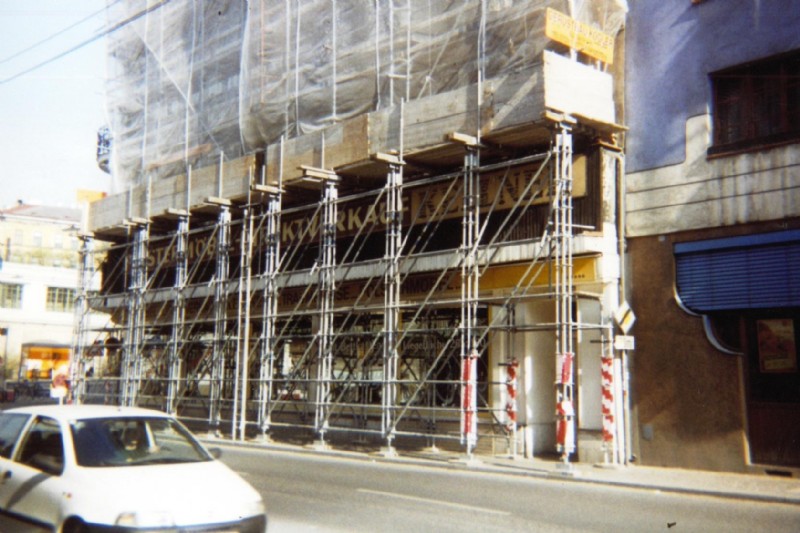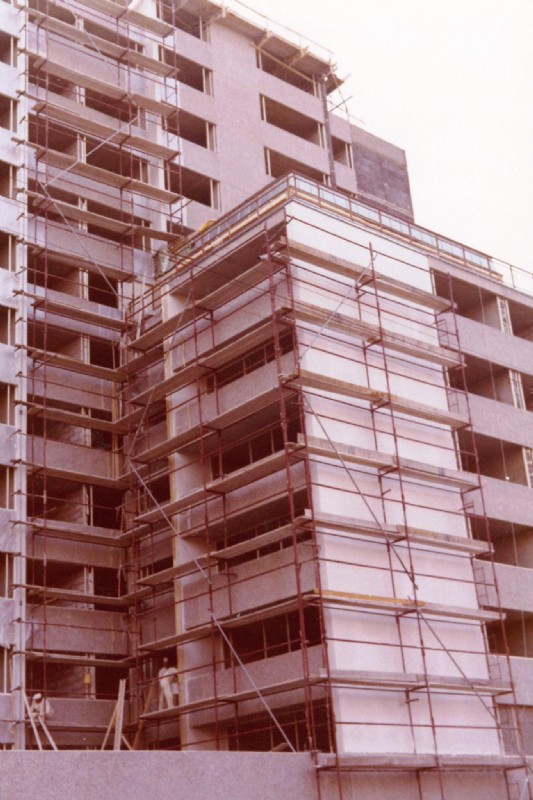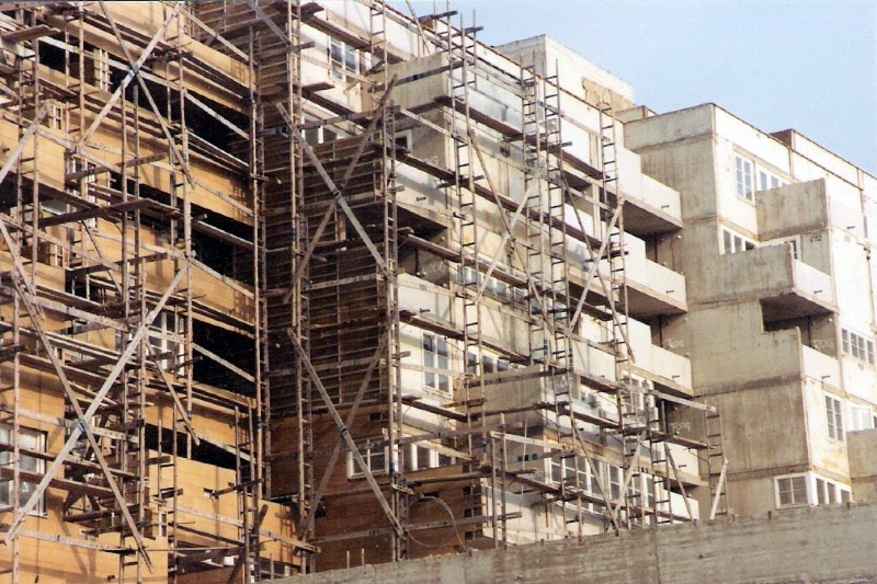 Die Gerüstbautechnik der 70er Jahre war das Leitergerüst. Ein- und Mehrfamilienhäuser wie auch urbane Wohnhausanlagen wurden so gerüstet.
